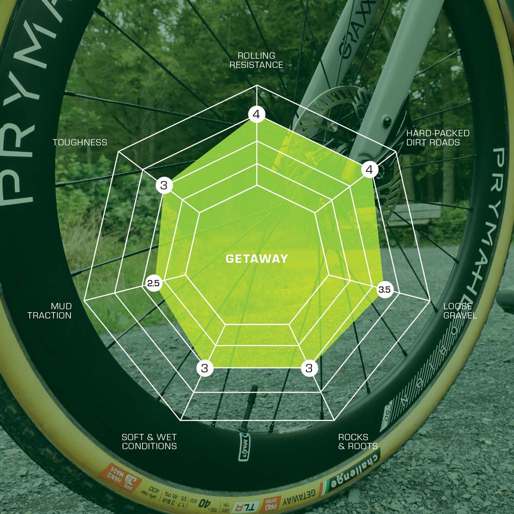 WHEN IT'S PERFECT – Getaway is the best choice for riders who enjoy a wide variety of roads. The tight knob pattern has terrific rolling resistance and almost velcro-like dry traction in sandy turns and on surfaces all the way up to champagne gravel. Getaway works best in dry to tacky conditions – anywhere the fast tread can grab clean dirt it’s a great choice.