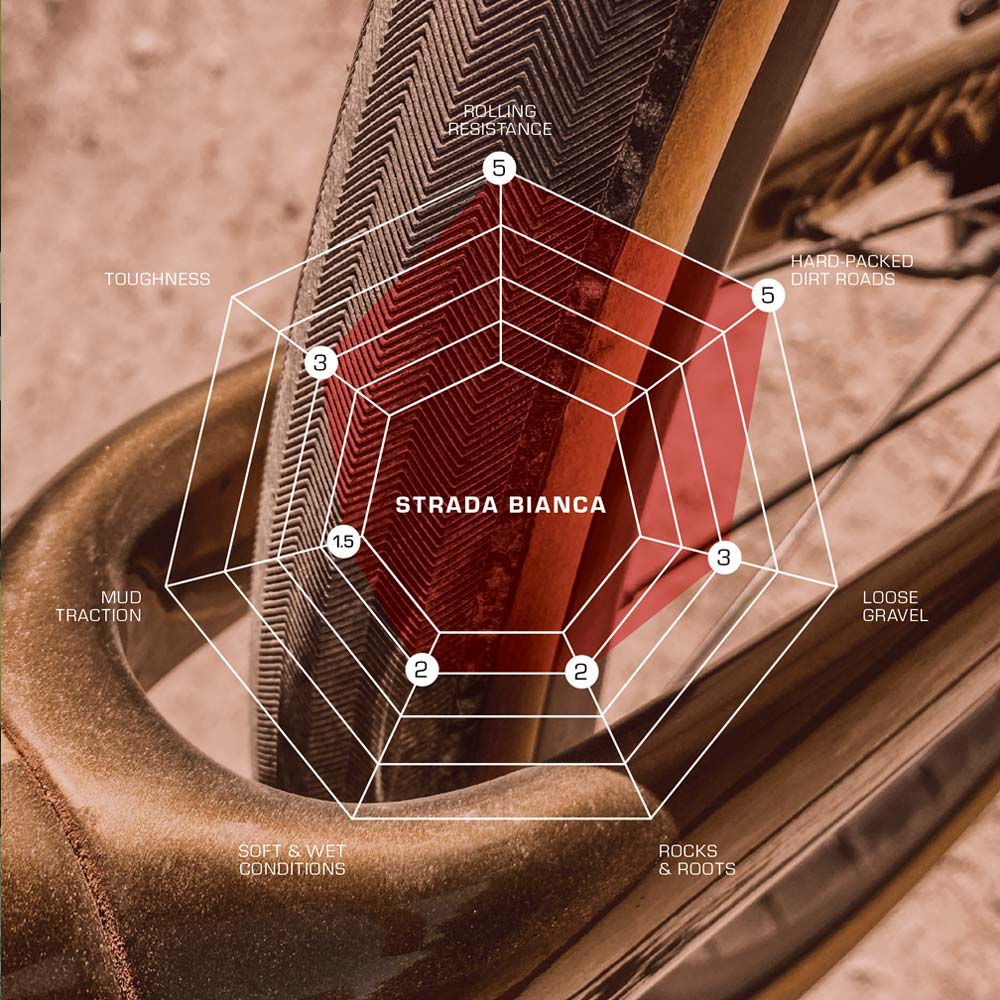 WHEN IT'S PERFECT – Strada Bianca is the winner when the roads are smooth, fast and dry. They are well suited for road rides that venture onto gravel and dirt roads that are predominantly hardpack. The low rolling resistance and responsive ride are at home on road bikes when a wider, more substantial tire is desired for daily rides.