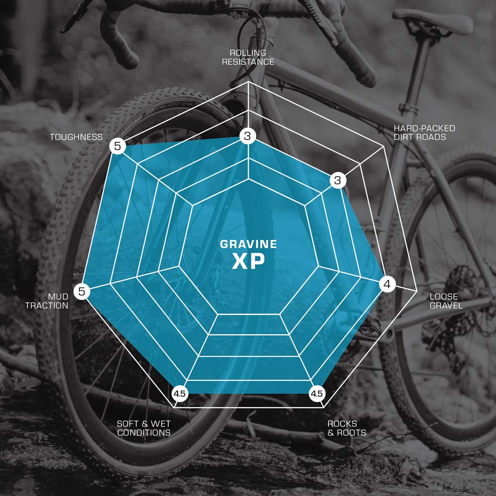 WHEN IT'S PERFECT - If rolling resistance and weight are secondary concerns while you’re bombing through stream beds down loose off-camber descents, the Gravine XP is going to be your favorite tire. From dry gravel to muddy fire road climbs, this tire is the solution when you want superior traction, protection and control without compromising a lively and supple ride.